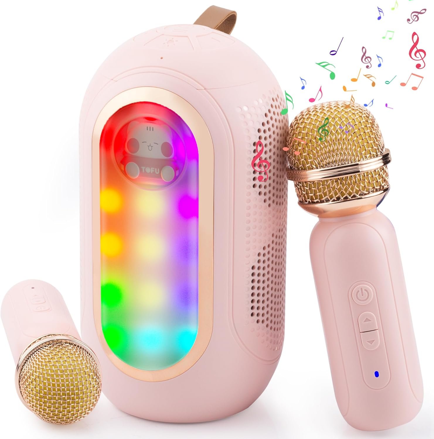 Vibrant entertainment: Immerse yourself in a lively world of entertainment with our capsule-shaped mini karaoke machine for kids. Enhanced by dynamic ambient light, you and your kids can enjoy moments together using two microphones and experience endless singing fun.