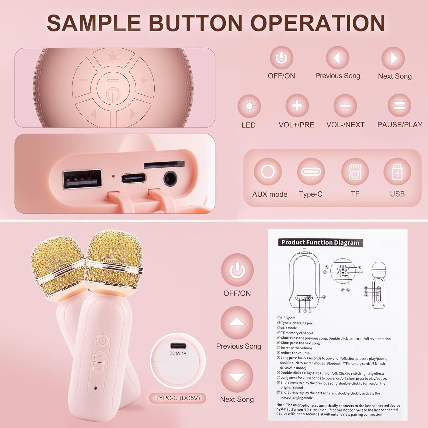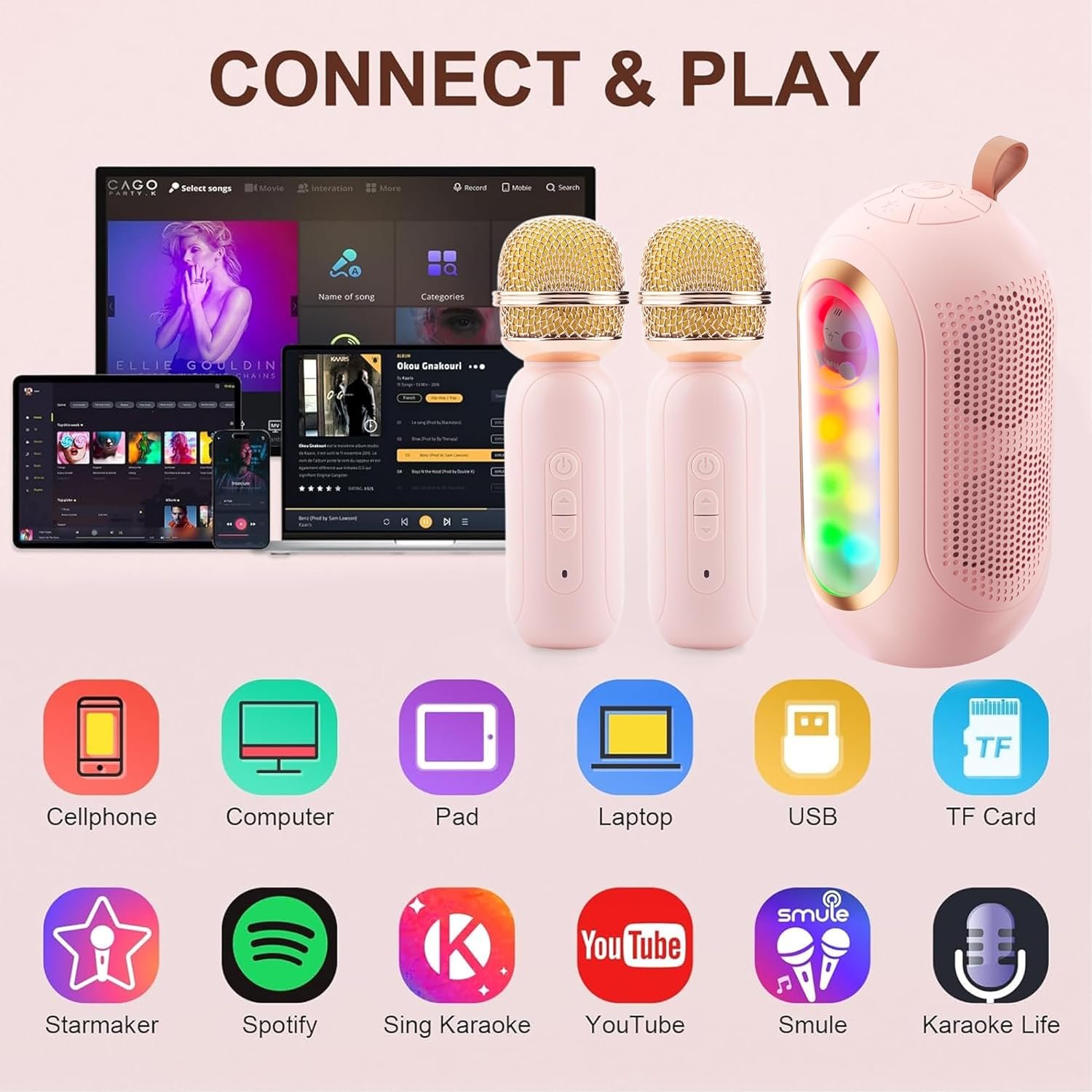 Versatile fun for all ages: In addition to karaoke, our device transforms into a bedside night light to keep you comfortable all night long. With multiple connectivity options such as TF card, USB drive, and AUX, as well as one-click original sound cancellation, it is a feature-rich device. Dual-mic duets and whimsical voice-changing effects, from female to monster, create a personalized and entertaining singing experience for the whole family.