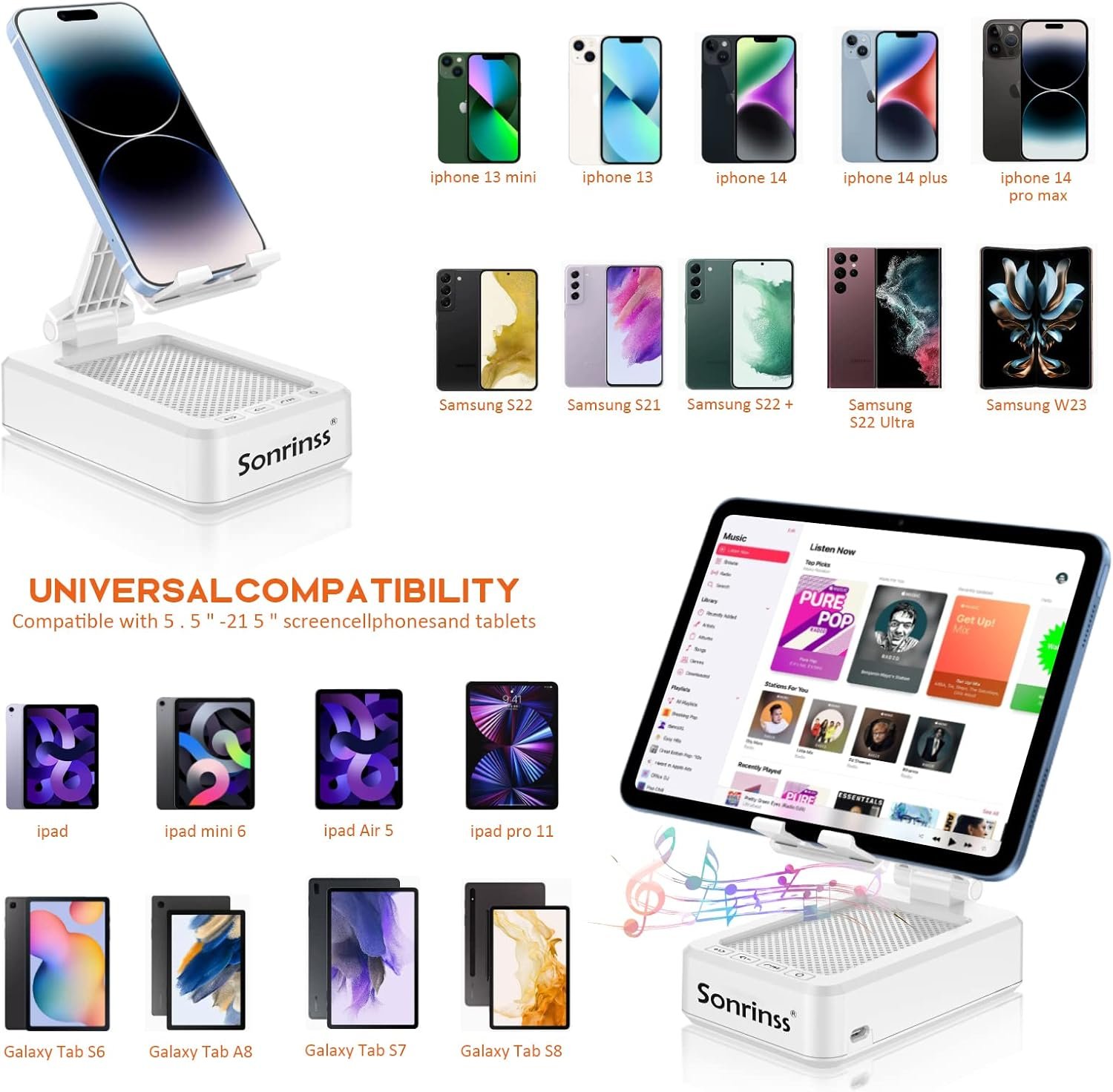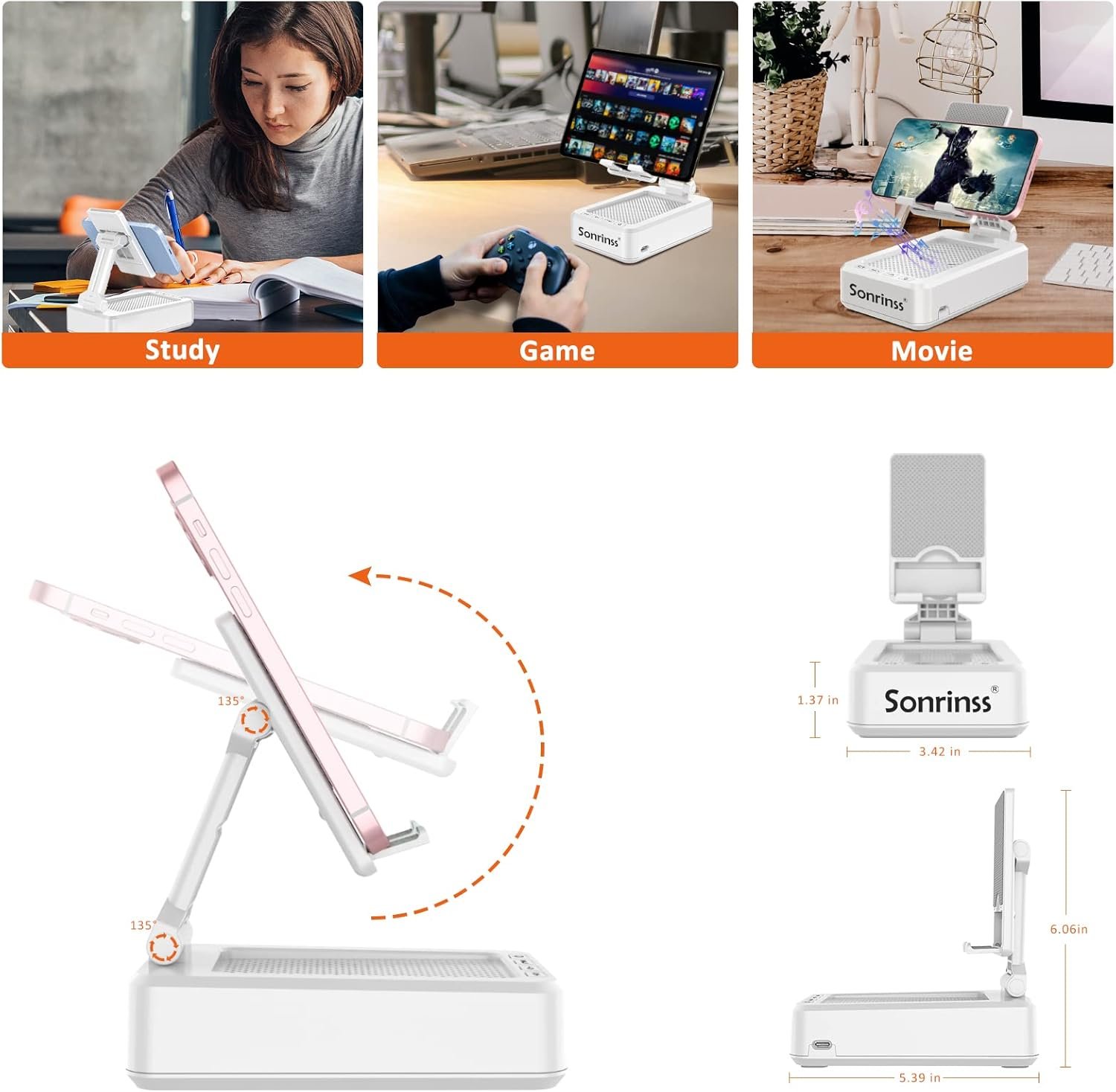 100% Satisfaction: Sonrinss cell phone stand for desk 1 years sales service for you. If you have any questions with our tablet stand for desk, or you aren’t 100% satisfied with our Bluetooth speaker with phone stand, please contact us freely, we can provide technical support when you need. Before operating, please read manuals carefully.