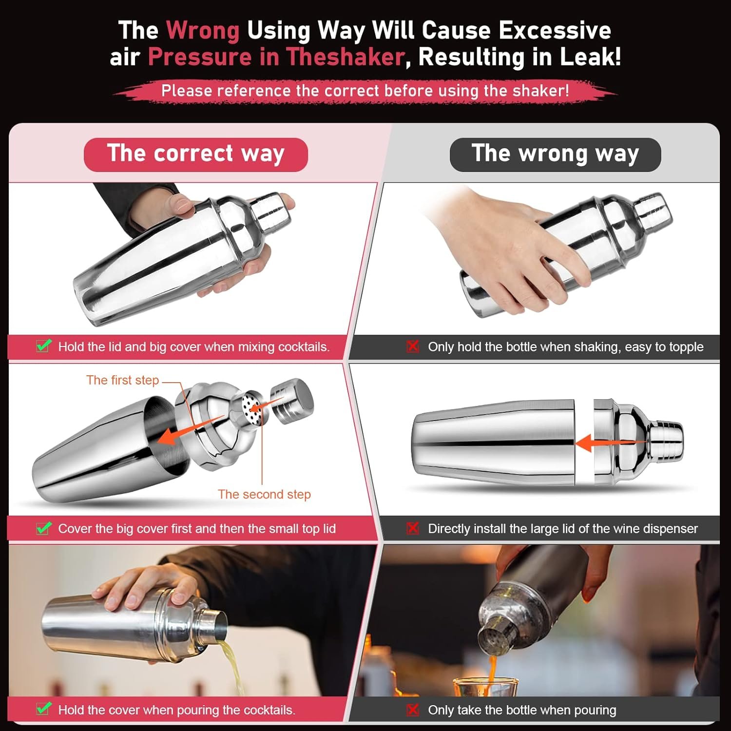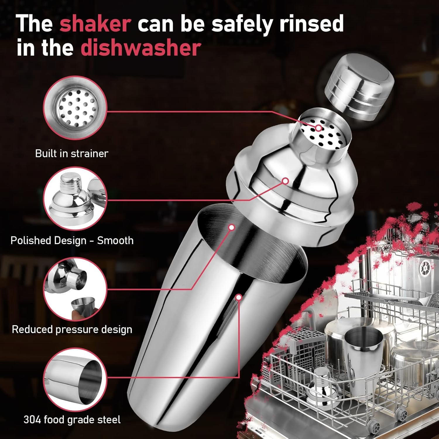 Safe Food Grade: Our Cocktail Shaker strictly complies with American food safety and has FDA food safety certification. It is made from 304 food-grade safe material (18/8), and has a modern mirrored finish to prevent rust. Its strong design will help it stand up to plenty of cocktail mixing and shaking!