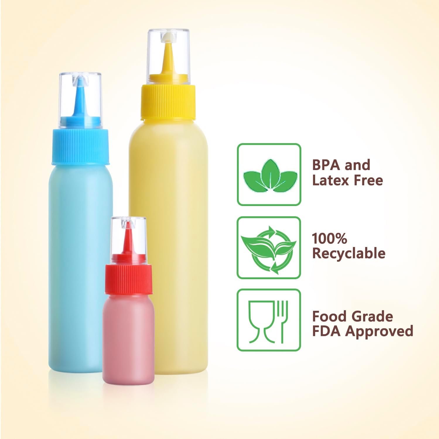 Easy Distinguish & Adjustable Tip – With 6-pack 3 option sizes transparent drizzle bottles and different color tips, allows you to use 6 different colors of spices/cream/icing at the same time and quick identification. The tip width of our precision icing bottles for cookie decorating is 1mm, you can easily adjust the width by cutting more of the tip to make for a very fine flow of icing or make a bigger opening.
