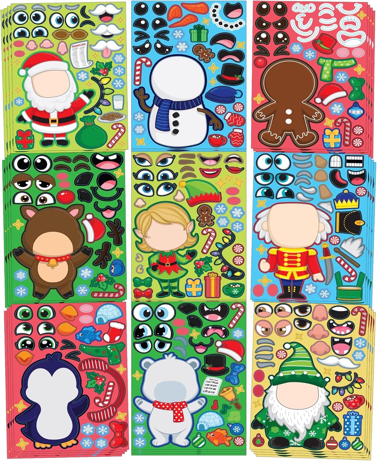 SUPER VALUE PACK. Get ready for endless festive fun with our 36-sheet make a face sticker craft set. Each set includes nine delightful designs, featuring beloved Christmas characters such as Santa santa, gingerbread man, snowman, elf, nutcracker, reindeer, penguin, Christmas gnome, and polar bear. With four sheets for each style, you’ll have plenty of 8″ x 5.4″ mix-and-match stickers to create unique holiday characters.
