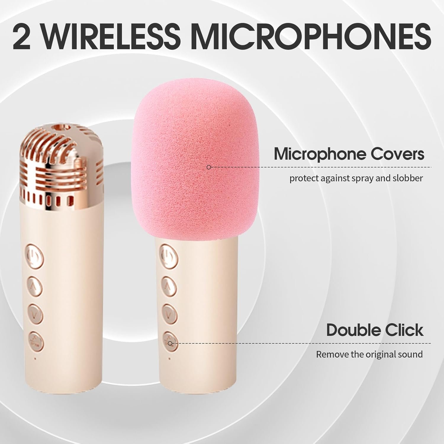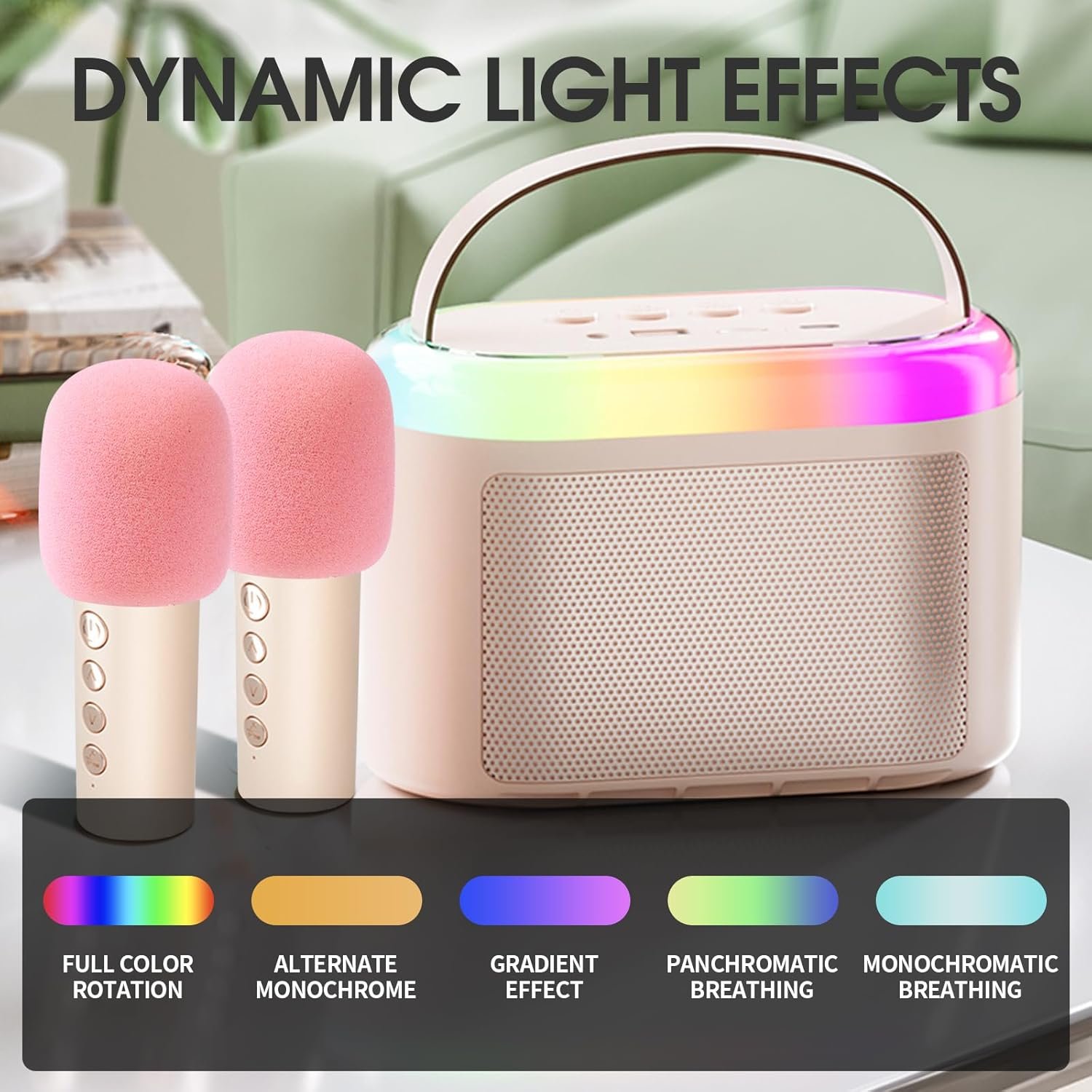 [2 Wireless Microphones]: This kids karaoke machine comes with 2 2.4G wireless rechargeable microphones and 2 microphone covers, 4 magical sounds and RGB colorful dancing light modes to make karaoke more fun, you can also use one button to eliminate the vocals and leave only the song’s accompaniment.