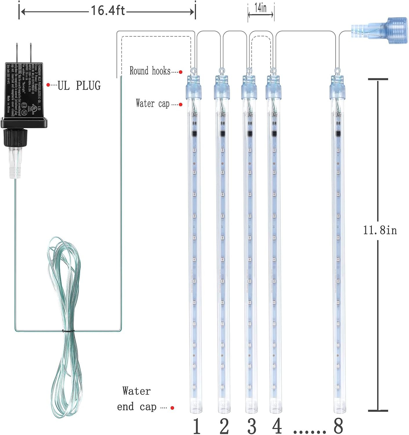 【Romantic Meteor Shower Lights】Led falling rain drop lights, the light of every bulb turns on and out one by one in sequence and quickly just like meteor shower or falling snow in the night sky, very beautiful. These icicle string lights can be used as one or be connected (The best effect is to connect 3-4 strings). If the whole light with 8 tubes can’t come light when you connect many sets, pls check the female and male connectors are linked correctly.