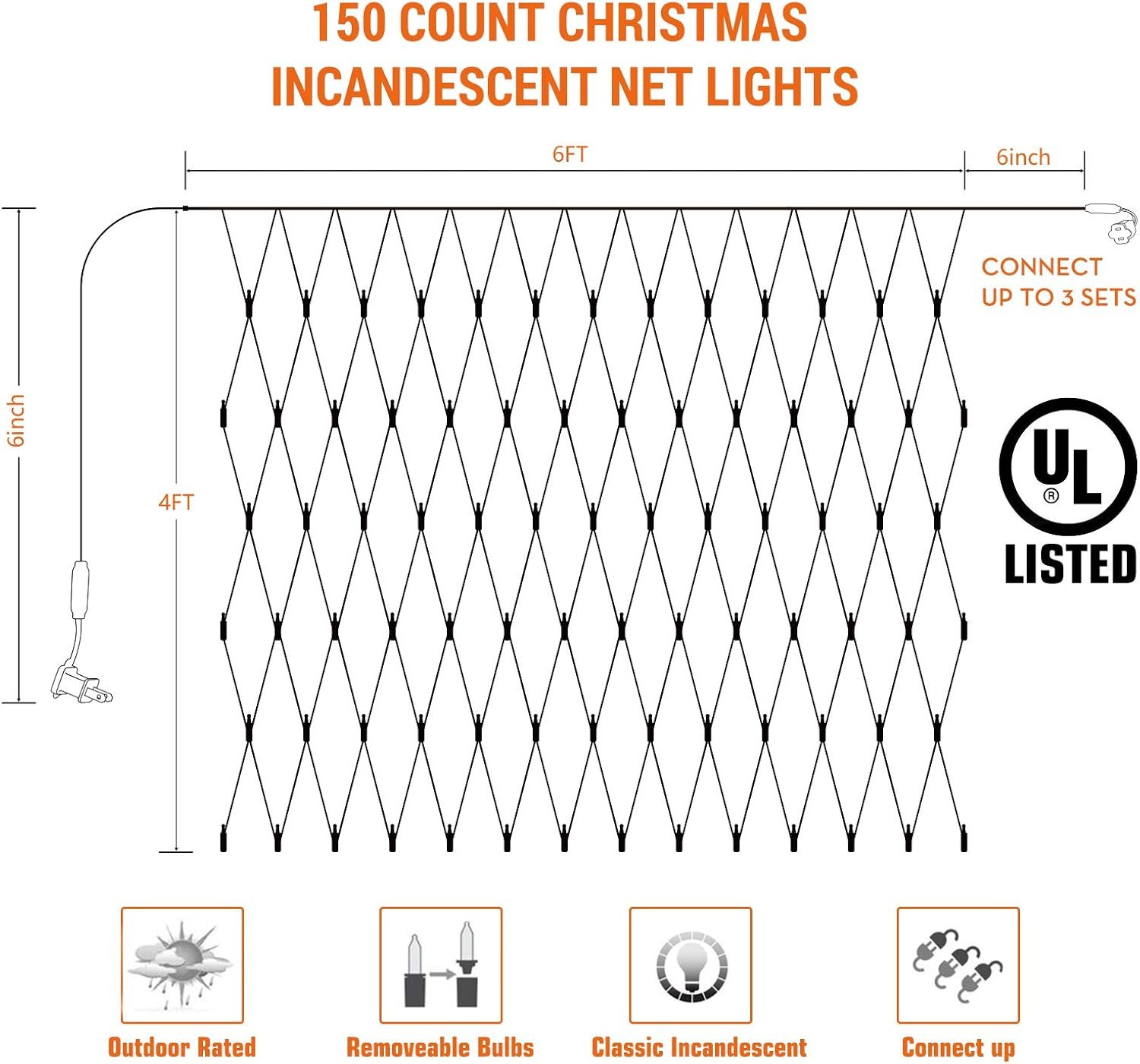150 count Christmas net mesh lights, non-LEDUL certifiedincandescent Christmas net lightsExtra Incandescent bulbs and fuses includedEnd to end connectable up to 3 sets