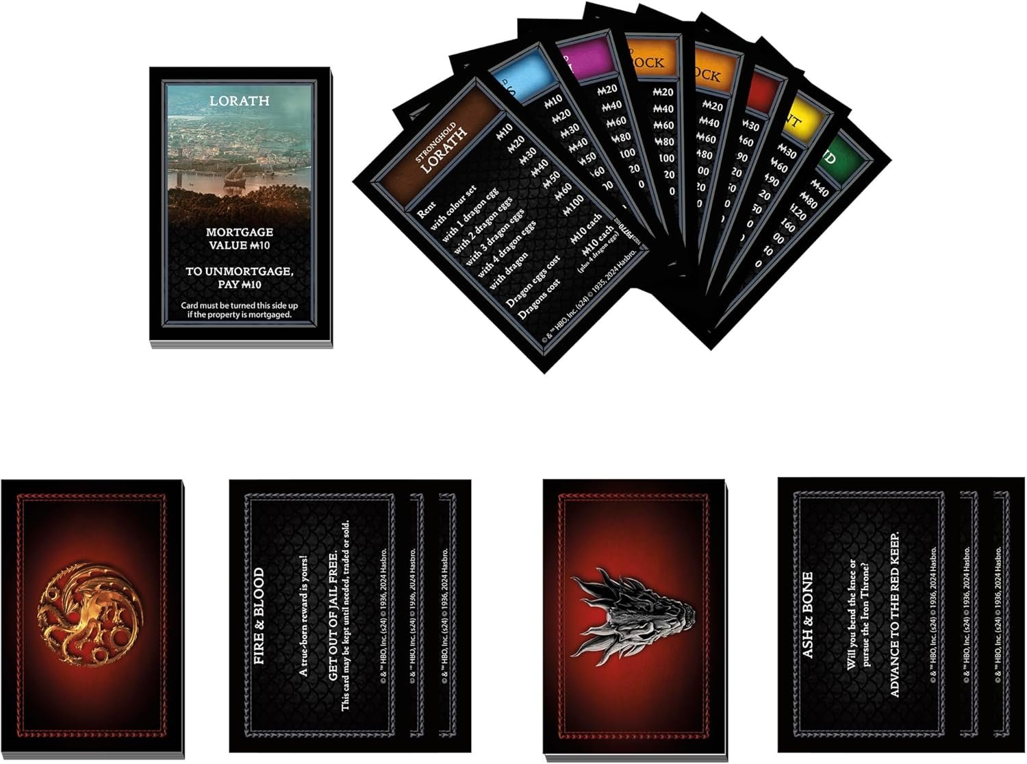 HOUSE OF THE DRAGON-THEMED MONEY: Includes 102 themed cardboard coins. The last player with coins when all others have gone bankrupt wins