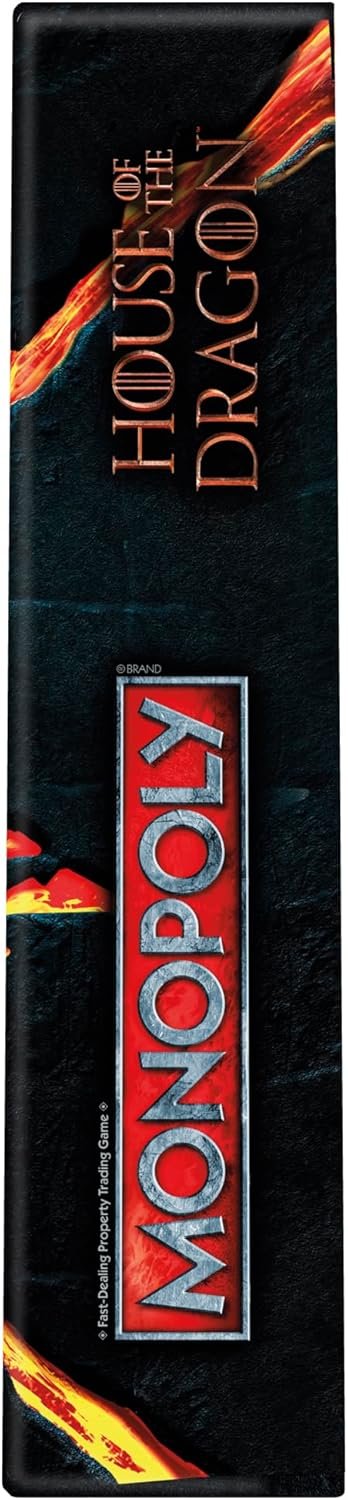 Battle for the Iron Throne in the Monopoly House of Dragon Edition game! A civil war is raging to claim the most powerful seat in the Seven Kingdoms. Pledge loyalty to a house by choosing one of 6 themed golden tokens. Then move around the board to travel through Westeros and across the Narrow Sea to Essos, and take control of strongholds, lands, and bays. The more you own, the more rent you can collect from opponents. Will you secure dragon eggs and fearsome dragons to bring your enemies to their knees? The last player with coins when all others have lost theirs wins! This strategy board game’s board, packaging, tokens, money, cards, and game pieces are all inspired by the popular TV series. Looking for fun adult board games for game night? This exciting game for ages 17+ is a great choice, and it makes a beautiful gift for fans of Game of Thrones and House of the Dragon. House of the Dragon and all related characters and elements ©&™ Home Box Office, Inc. (s24) The Hasbro and Monopoly names and logos, the distinctive design of the gameboard, the four corner squares, the Mr. Monopoly name and character, as well as each of the distinctive elements of the board and playing pieces are trademarks of Hasbro, Inc. for its property trading game and game equipment.