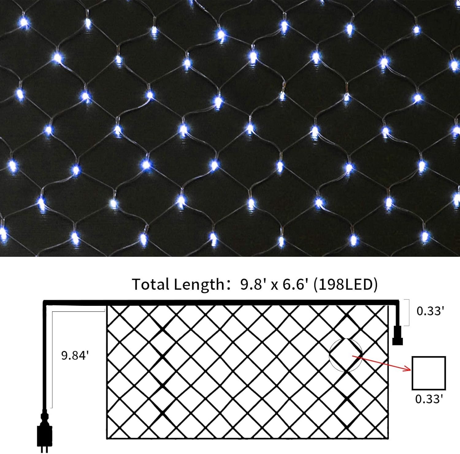 Christmas net lights specification : The outdoor net lights includes 198 count mini led lights, mesh panel size is 9.8ft x 6.6ft, 9.84ft lead wire, 0.33ft tail wire