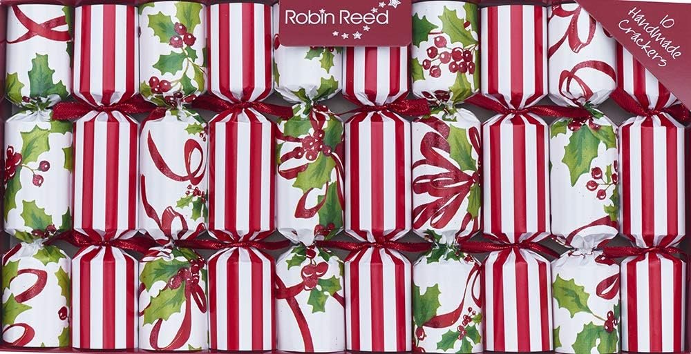 10 x 8.5″ inch Handmade English Christmas Party Favors/Decorations. Bright candy cane stripe and contemporary holly with red glitter detail finished with red glittery ribbons. Contains party crowns, jokes, quiz and fun novelty gifts.