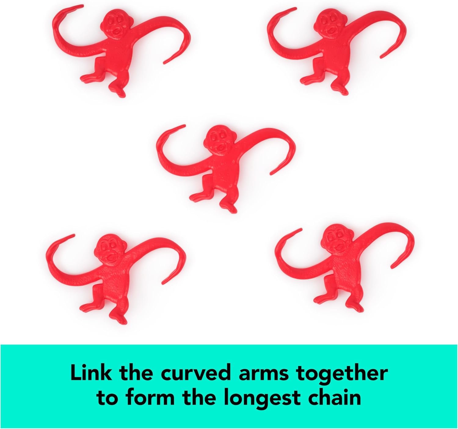 AS FUN AS A BARREL OF MONKEYS: Pour out the barrel and link the curved arms together to try to form the longest chain of monkeys. Whoever collects the most monkeys in one turn, wins!