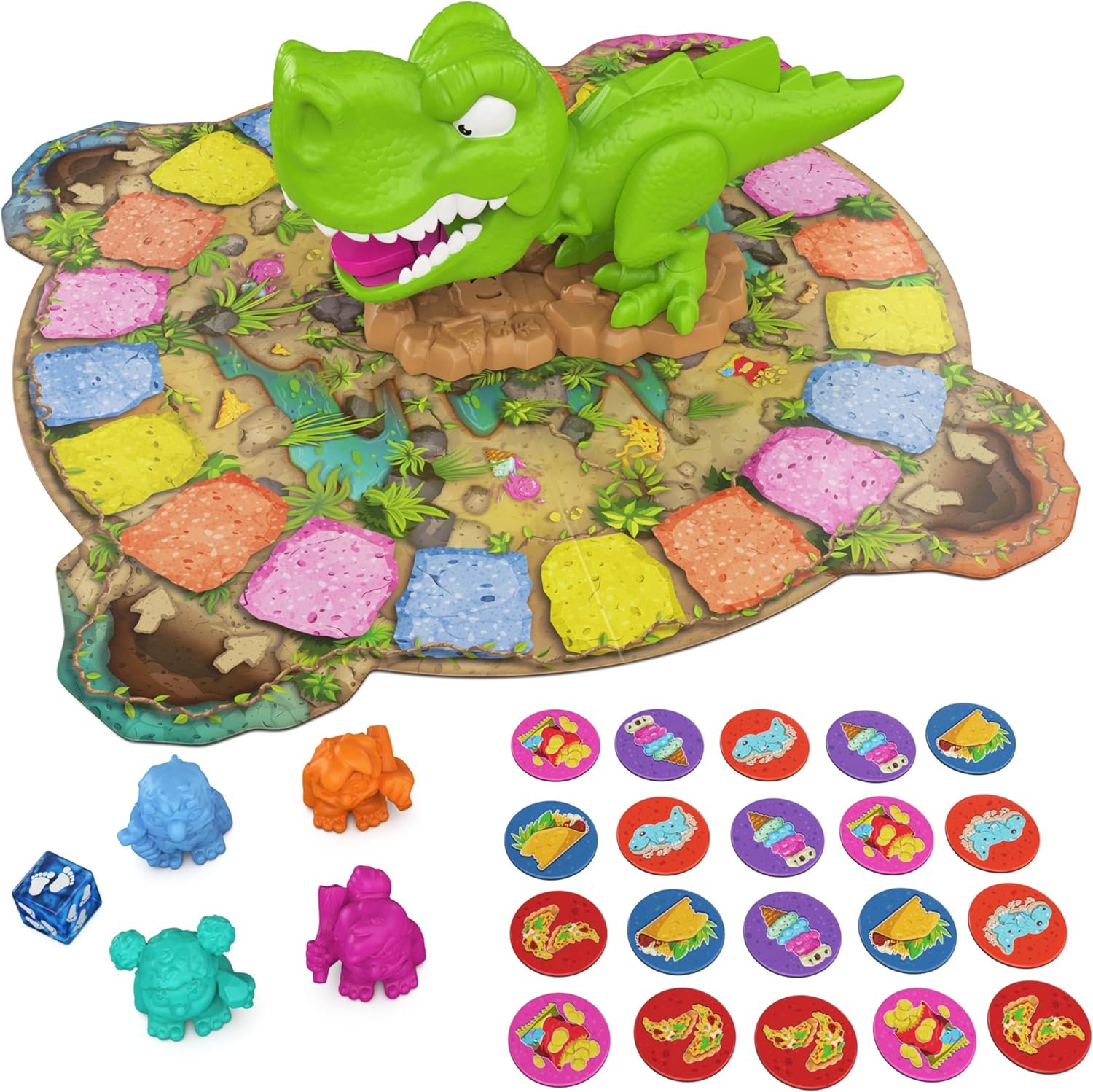 HUNT AND GATHER FUN: Gather 2-4 players ages 5+ who love snacks, jungle adventures, and dodging dino tongues to collect the yummy snacks, like tasty taco-dactyl and prehistoric pizza, along their path.