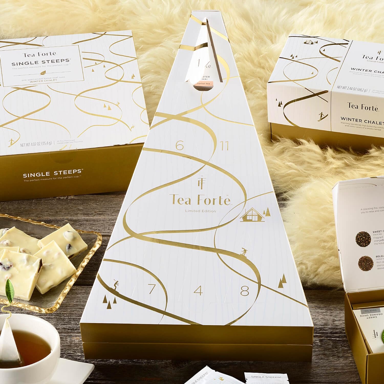 LIMITED EDITION – Winter Chalet Advent Calendar contains 12 cozy teas featuring Tea Forte’s signature pyramid infuser tea bag.